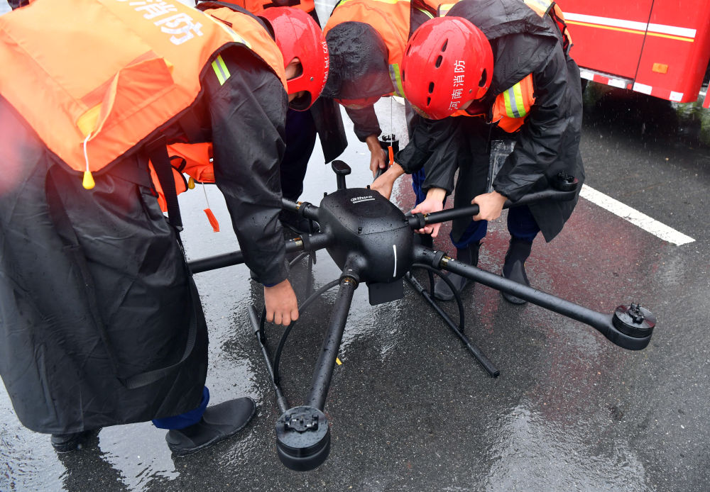 ↑7月20日,在焦作市修武县周庄镇万方路万方桥附近,消防人员在进行无人机起飞准备工作。