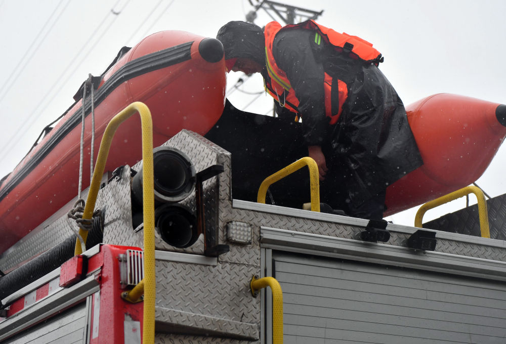 ↑7月20日,在焦作市修武县周庄镇万方路万方桥防汛现场,消防人员在为冲锋舟排水。