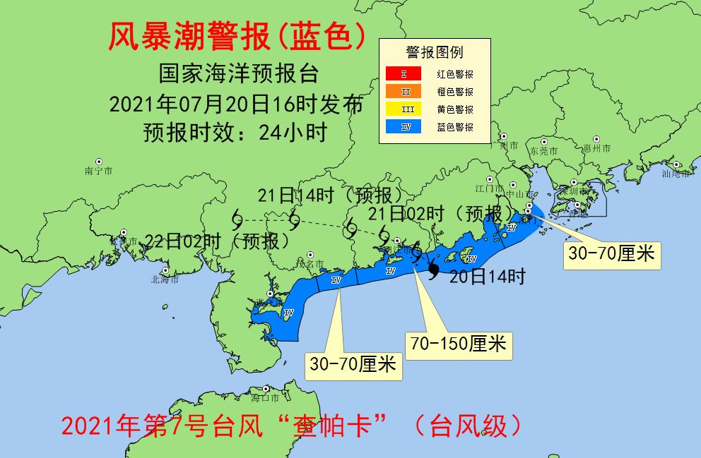 风暴潮方面, 受今年第7号台风“查帕卡”(台风级)的影响,预计7月20日下午至21日下午,广东江门、茂名和湛江北部沿海将出现30到70厘米的风暴增水,阳江市沿海将出现70到150厘米的风暴增水。上述岸段内的潮位站将不会出现达到当地蓝色警戒潮位的高潮位。风暴潮预警级别为蓝色。