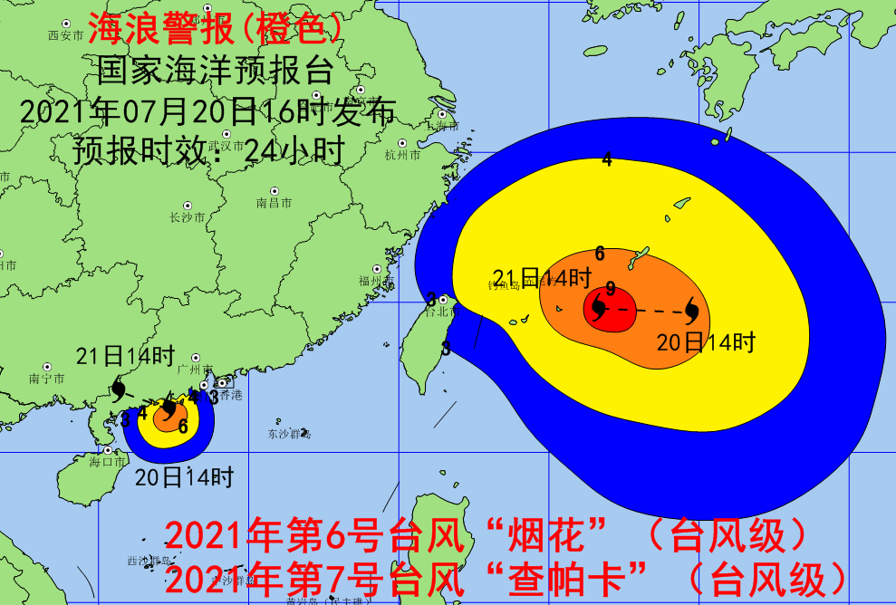受两个台风的影响,最新的海浪数值预报显示,受台风“烟花”的影响,东海南部将出现6到10米的狂浪到狂涛区。国家海洋预报台20日下午发布海浪橙色警报和风暴潮蓝色警报。