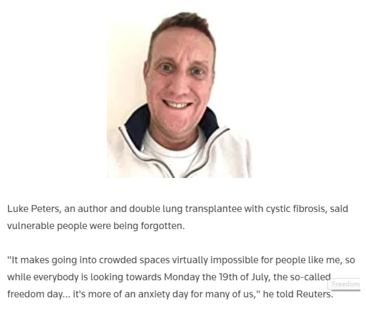 曾因囊性纤维化做过双肺移植手术的作家卢克·彼得斯也是正在“体会恐惧”的一位。彼得斯对路透社说,像他这样的脆弱人士正在被遗忘。“当所有人都在期待所谓‘自由日’的时候,对我们来说,这更像是焦虑的一天”。