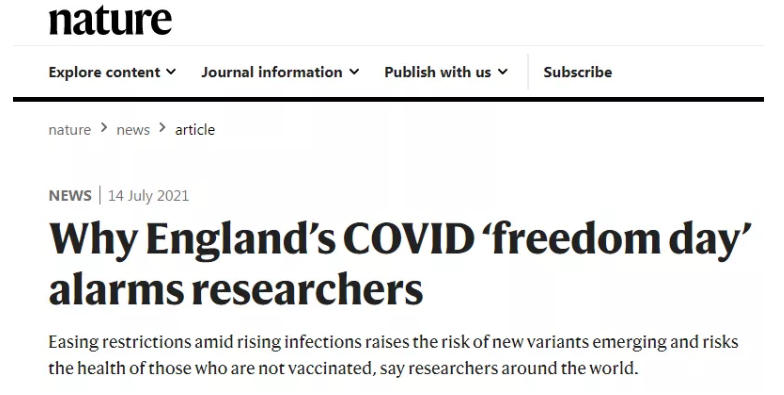 《自然》杂志发文指出,目前全世界都在关注英国,因为“研究人员担心,在还没有完全接种新冠疫苗的人群中可能会出现高感染率,从而促使病毒产生进一步变异,然后输出到世界各地”。