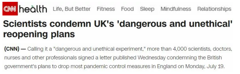 基于严峻的疫情现实,担忧情绪已不仅仅限于英国国内,世界各地的许多科学家和卫生专家都对英国的解封政策提出质疑。