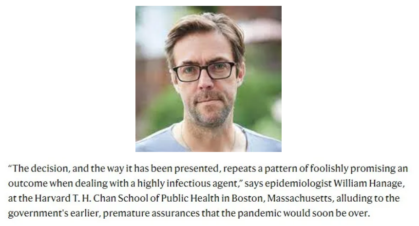 文章引述流行病学家威廉·哈纳奇的话说:“英国政府的这个决定,以及它被呈现的方式,重复了一种模式——在处理一个具有高传染性的病原体时,愚蠢地对某个既定结果做出承诺。”。