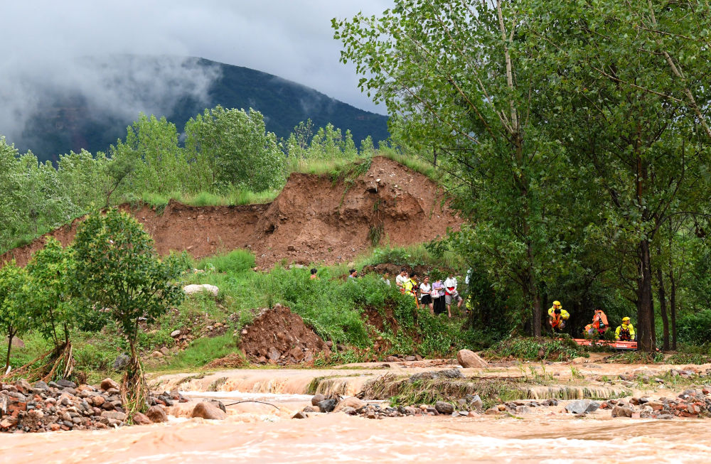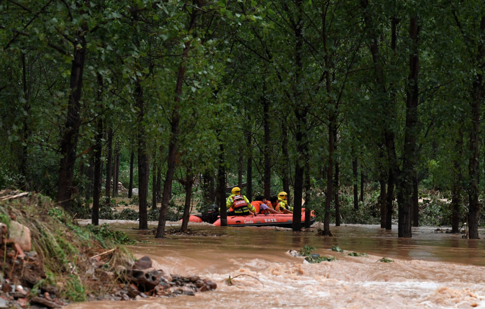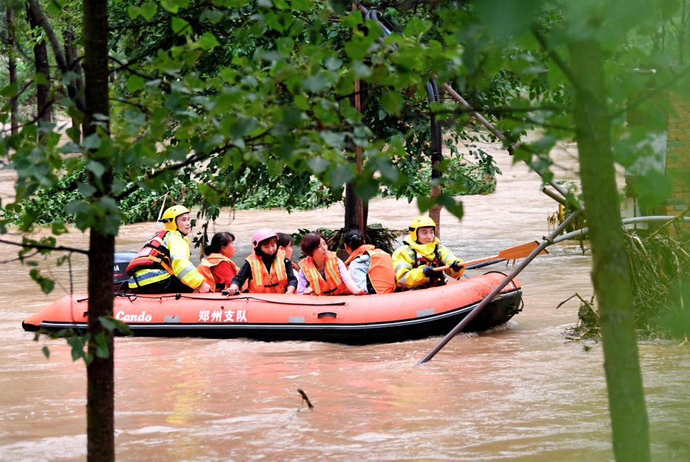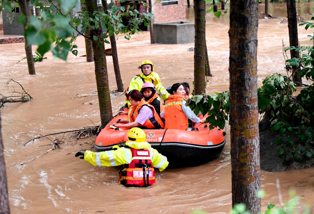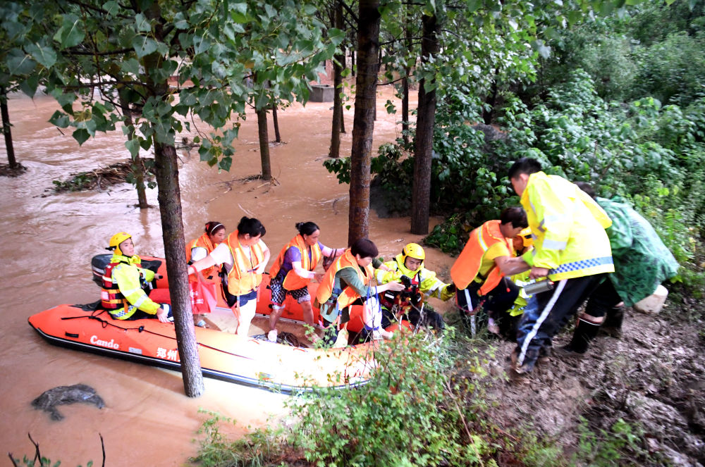 7月20日,消防救援人员在转移被困村民。
