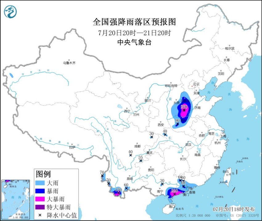 中央气象台20日18时继续发布暴雨橙色预警。预计,7月20日20时至21日20时,河南中北部、河北南部、山西东南部以及广东中西部沿海、广西东南部、云南南部等地的部分地区有暴雨到大暴雨,其中河南北部局地有特大暴雨(250~270毫米),上述部分地区伴有短时强降水(最大小时降雨量30~50毫米,局地可超过70毫米),局地有雷暴大风等强对流天气。