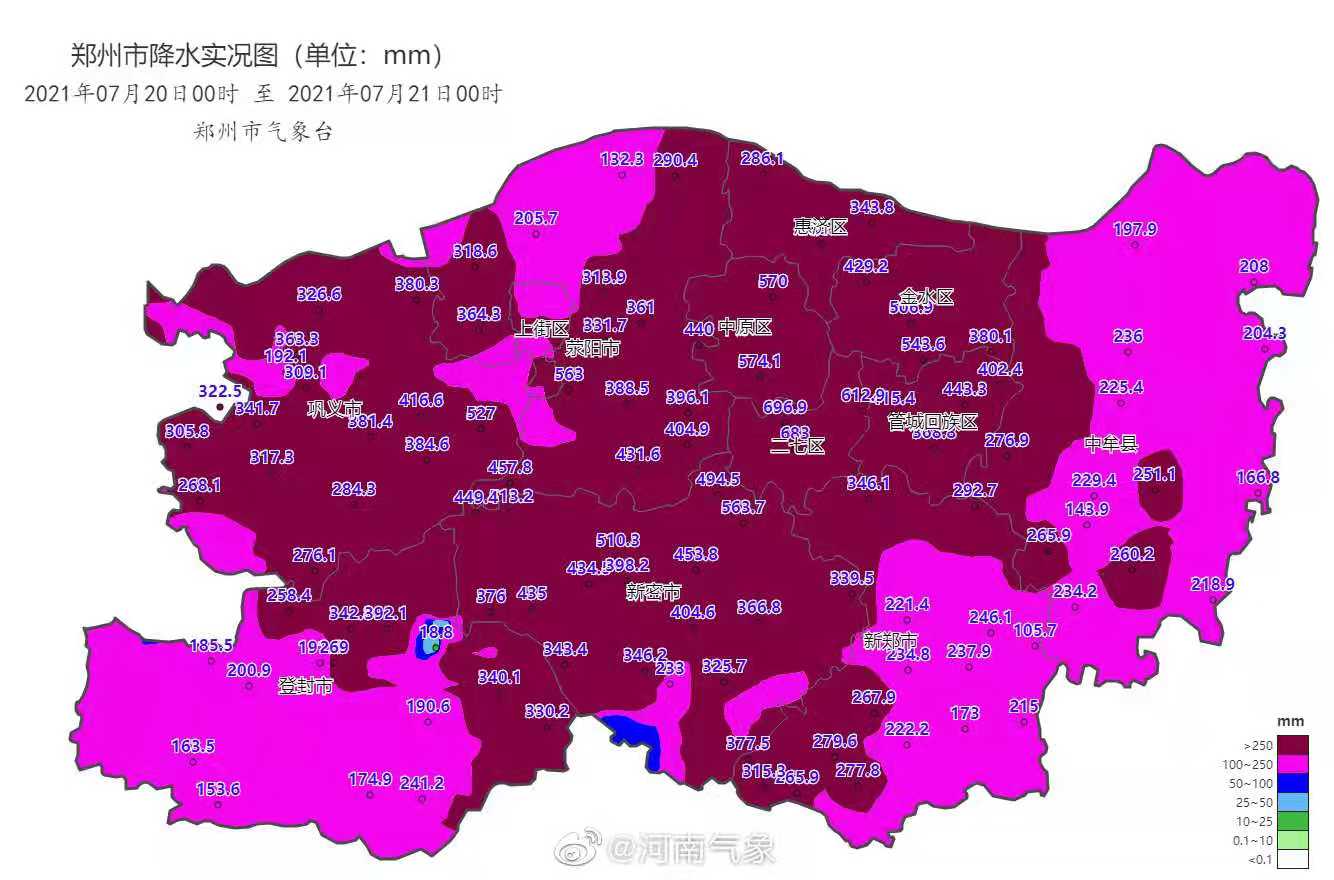 近24小时郑州市降水实况:20日0时—21日0时,郑州普降大暴雨特大暴雨,有七成测站超过250毫米(特大暴雨)。最大降雨量出现在郑州市尖岗696.9毫米,最大小时雨强出现在郑州本站201.9毫米(20日16—17时)。