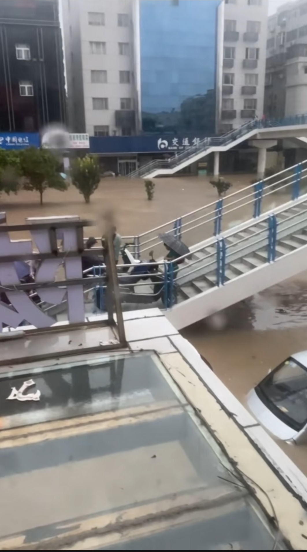 郑州市京广中路花仙女鲜花店的店员杨先生告诉新京报记者,从20日14时许开始,水位上涨,一楼的商铺已经被淹。他提供的照片和视频显示,商铺对面是一座天桥,多辆轿车泡在水中,有人打着伞趟着水行走。