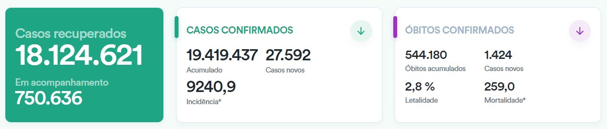 截至当地时间7月20日19时30分,根据巴西卫生部发布的数据,巴西单日新增新冠肺炎确诊病例27592例,累计确诊19419437例;新增死亡病例1424例,累计死亡544180例;累计治愈病例18124621例。