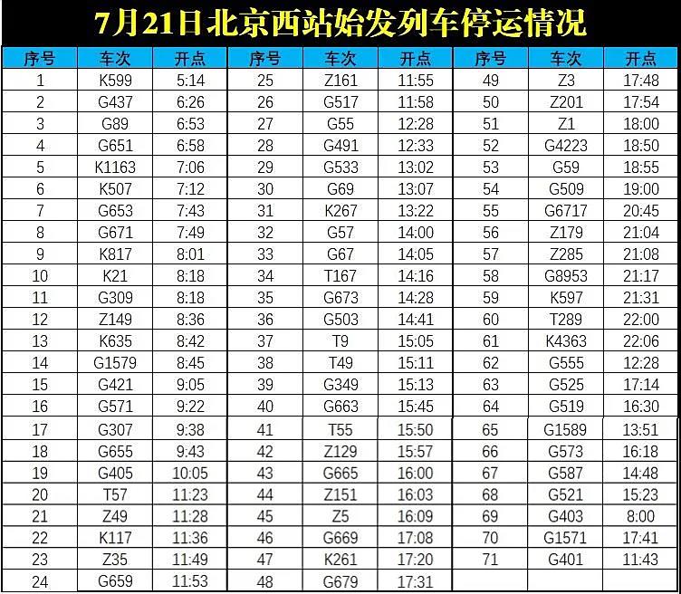 受河南多地遭遇持续强降雨天气影响,7月21日北京西站以下始发列车停运。