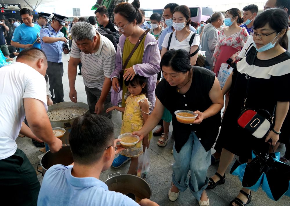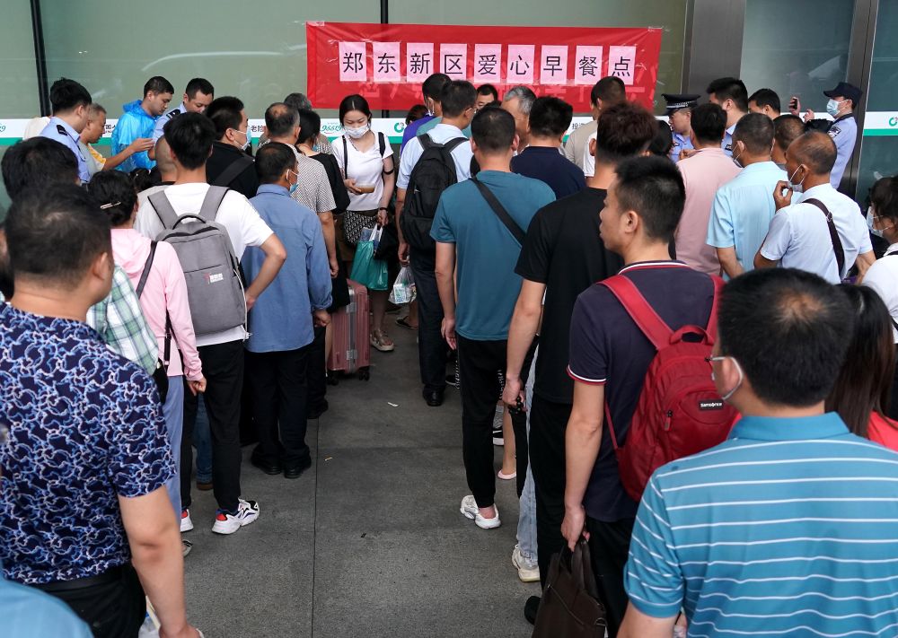 ↑7月21日,滞留旅客在郑州东站进站口处排队领取早餐。