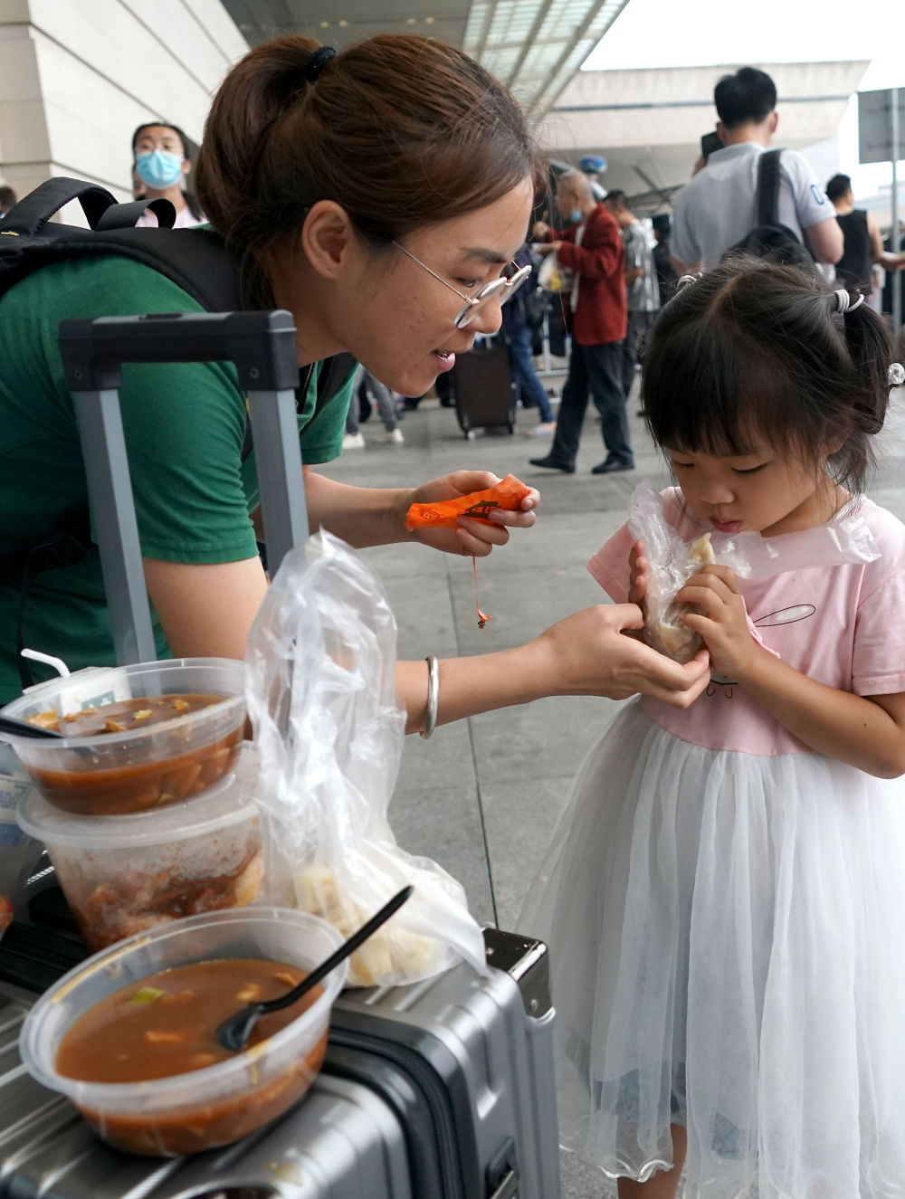 ↑7月21日,一名滞留旅客在郑州东站进站口处喂孩子吃早餐。