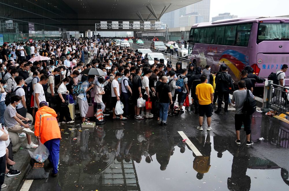 ↑7月21日,滞留旅客在郑州东站进站口处排队登乘大巴车。