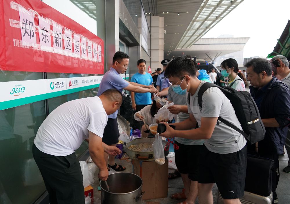 ↑7月21日,工作人员在郑州东站进站口处为滞留旅客提供早餐。