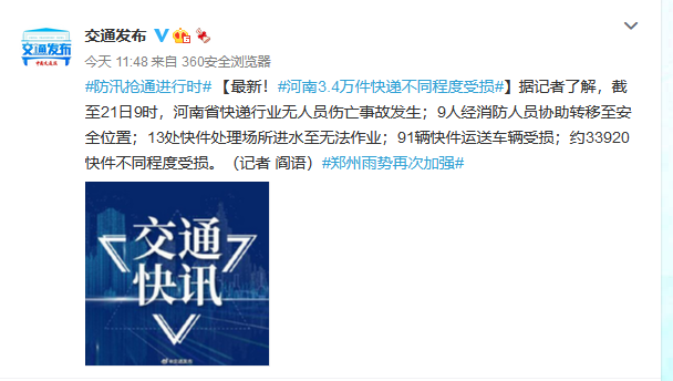 央视网消息:据“交通发布”官方微博消息,截至21日9时,河南省快递行业无人员伤亡事故发生;9人经消防人员协助转移至安全位置;13处快件处理场所进水至无法作业;91辆快件运送车辆受损;约33920快件不同程度受损。