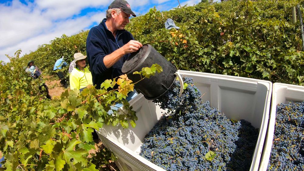 2019年3月26日,在澳大利亚南澳州阿德莱德山,采摘工人将刚摘下的成熟的葡萄装车。新华社发(潘翔越摄)