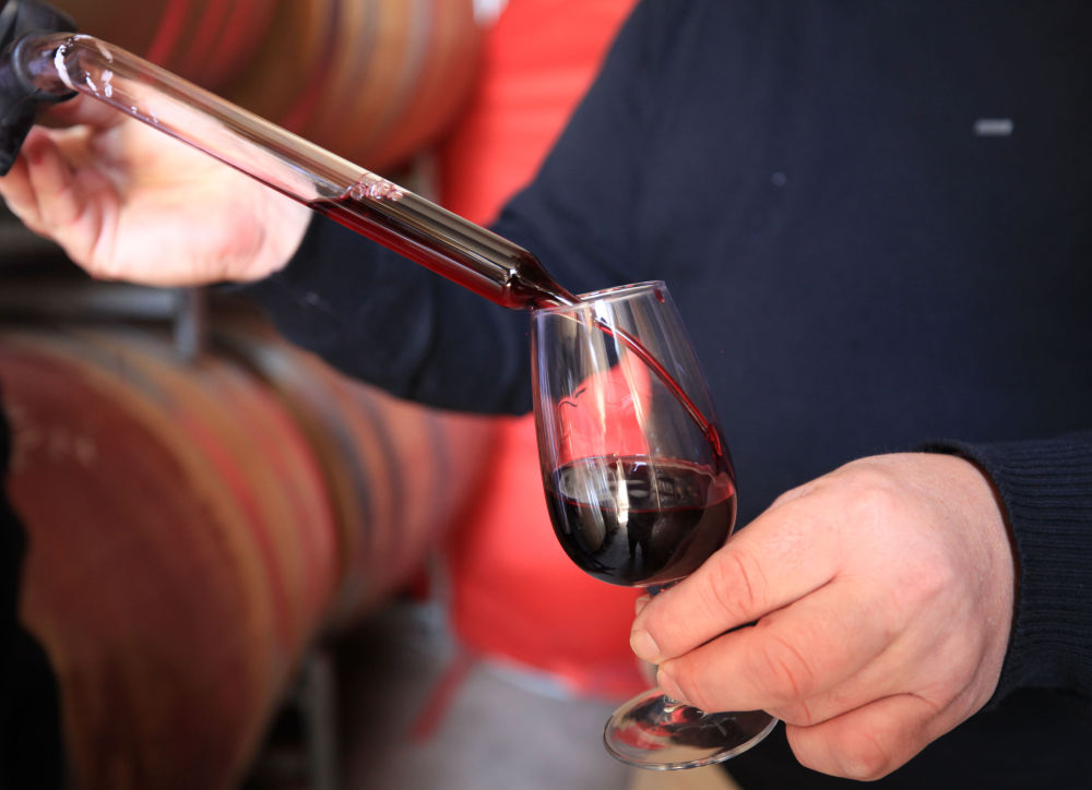 2018年10月11日,在澳大利亚阿德莱德山区的酒庄,工作人员从木桶中取酒。新华社发(潘翔越摄)