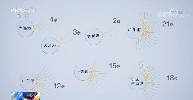 景气度指数之下是各大港口货畅其流,航空、铁路货运量持续增长的繁忙景象。先看海运,中国港口网通过大数据监测发现了两个新变化,一是今年上半年,进出中国主要港口的货船数量持续保持着上升态势;再一个,往返中国的世界货运版图上增添了许多新航线。仅7个主要港口的新增航线就接近80条,其中,广州港、宁波舟山港、上海港以及山东港都新增了10条以上,他们的目的地遍布亚、非、欧、美等四个大洲。