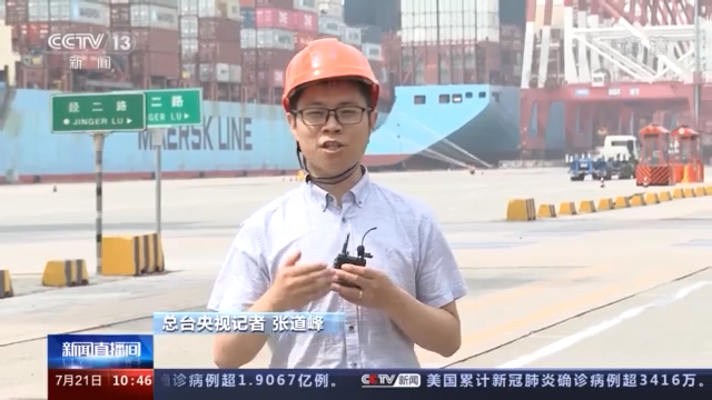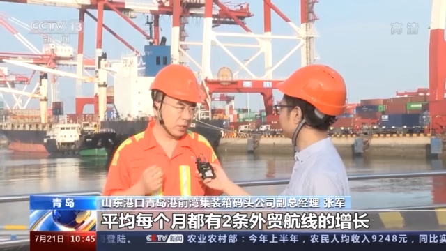 山东港口青岛港前湾集装箱码头公司副总经理 张军:平均每个月都有2条外贸航线的增长,上半年我们的箱量实现了两位数的增长,无论是从箱量的增长还是从航线增长,反映出国家对外贸易经济向好的趋势。