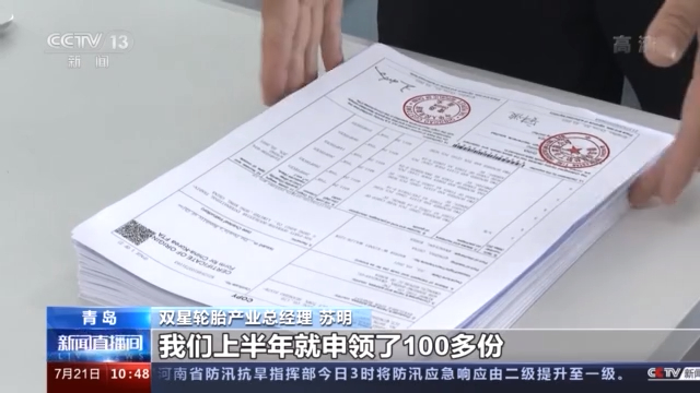 双星轮胎产业总经理 苏明:这个是我们(出口)韩国的原产地证书、这是马来西亚的,这是印度尼西亚的,像这种原产地证书我们上半年就申领了100多份,像你手里拿的这一份是出口韩国的,这一单我们就节省了关税差不多达到了30万元人民币。