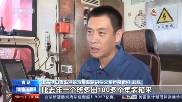 山东港口青岛港前湾集装箱码头公司桥吊司机 郭磊:我今年感觉到特别的忙,我现在每个班都能干五六百个集装箱,比去年一个班多出100多个集装箱来。