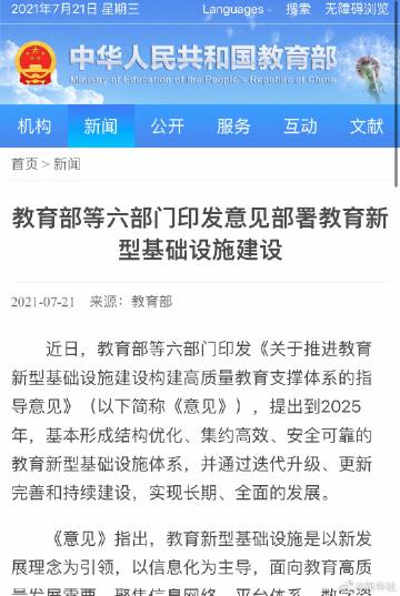 #六部门发文推进建设教育专网#【六部门:#建设教育专网连接各级各类学校和教育机构#】记者21日从教育部了解到,教育部等六部门印发《关于推进教育新型基础设施建设构建高质量教育支撑体系的指导意见》,提出建设连接全国各级各类学校和教育机构间的教育专网,提升学校网络质量;构建“互联网+教育”大平台;推动数字资源的供给侧结构性改革;支持有条件的学校利用信息技术升级教学设施、科研设施和公共设施,促进学校物理空间与网络空间一体化建设;依托“互联网+教育”大平台,创新教学、评价、研训和管理等应用;有效感知网络安全威胁,过滤网络不良信息等。(记者胡浩)