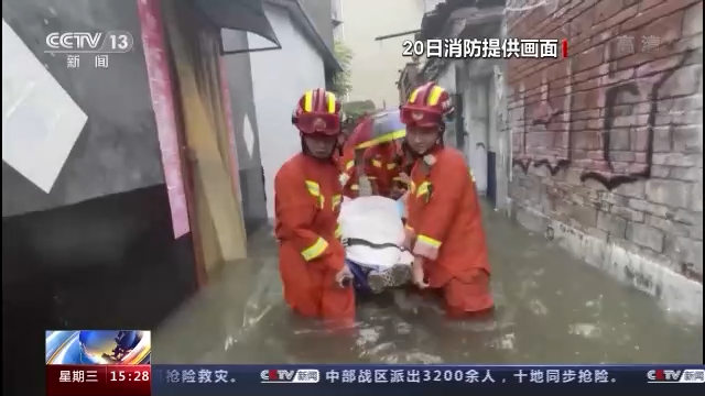 7月20日,河南新乡迎来大范围降雨,致使部分居民家以及养老院内进水,为了老人的安全,救援人员用担架将老人转移至安全区域。