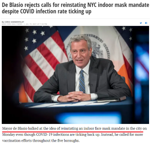 目前该市疫情正在反弹,近42%的市民尚未接种疫苗,但纽约市长比尔·德布拉西奥却断然拒绝了卫生专家们提出的恢复室内口罩令要求,强调“应把所有注意力放在加强疫苗接种上”。