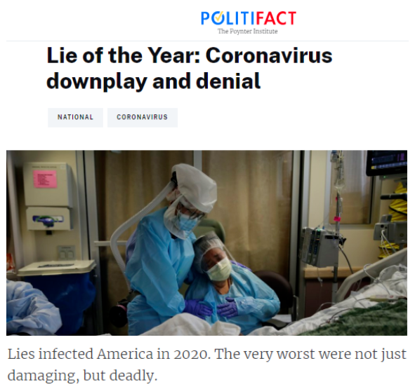 去年年底,美国时政网站“政治事实”(politifact)按惯例评选出了2020年“年度谎言”。结果,“淡化和否认新冠肺炎疫情”拔得头筹。该网站给出的理由很直白:最糟糕的谎言不只有害,更要命。