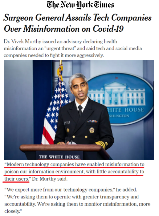 此前的15日,美公共卫生局长维维克·穆尔西也警告称,那些“现代科技公司”让虚假信息在其平台上“几乎不负责任地传播”,已经构成了“对我们国民健康的迫在眉睫的潜在威胁”。政府要求社交网站“更密切地监控虚假信息”。