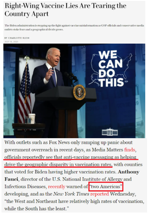 在政府官员们看来,反疫苗信息造成了疫苗接种率的地理差异,“投票给拜登(民主党)的县接种率明显更高”。美国首席传染病专家福奇最近更是把民主、共和两党控制地区疫苗接种率的差异形容为“两个美国”。
