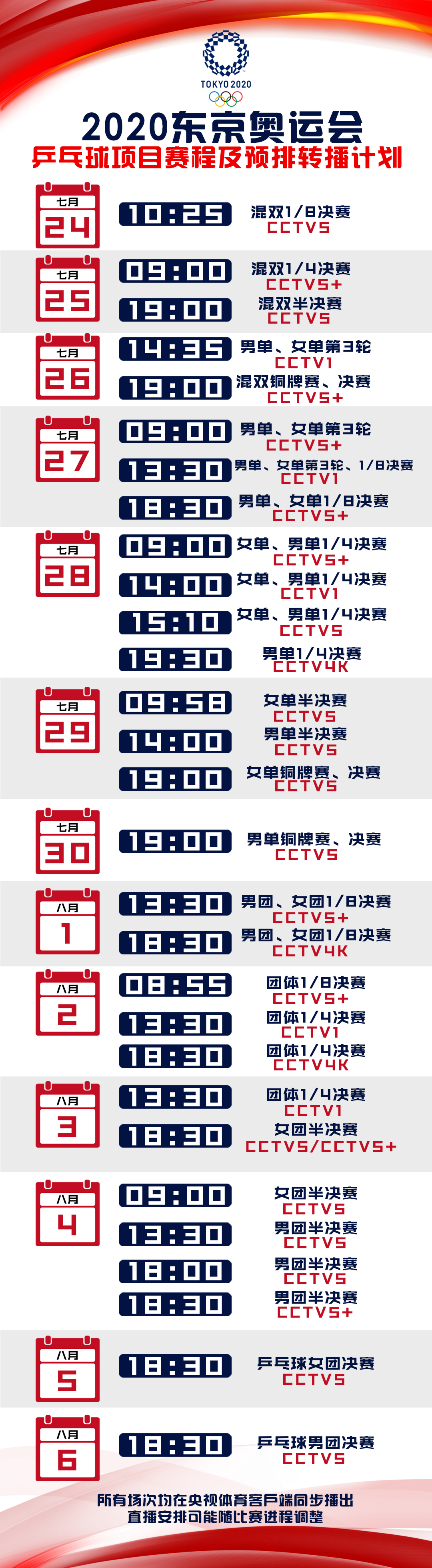 东京奥运会乒乓球比赛将于7月24日-8月5日进行,共将产生混合双打、男女单打和男女团体五枚金牌。