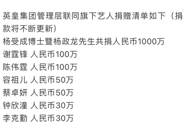 香港英皇集团主席杨受成及执行董事杨政龙率旗下艺人捐款1360万人民币驰援郑州抗洪救灾。