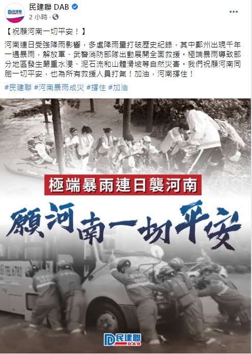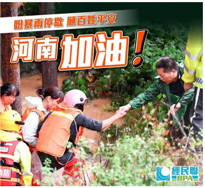 香港民建联表示,祝愿河南同胞一切平安,也为所有救援人员打气!