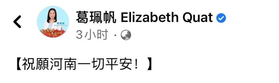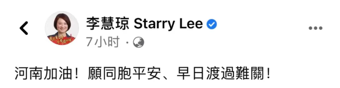 民建联主席李慧琼发文为河南加油,并祝愿同胞平安,早日渡过难关。