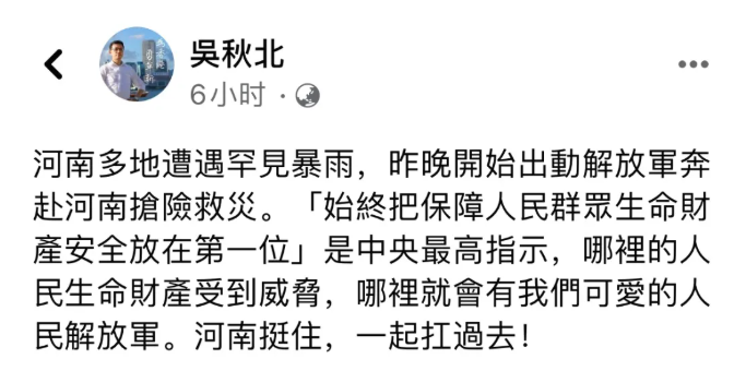 港区全国人大代表、香港工联会会长吴秋北表示:“始终把保障人民群众生命财产安全放在第一位是中央最高指示,哪里的人民生命财产受到威胁,哪里就会有我们可爱的人民解放军。河南挺住,一起扛过去!”