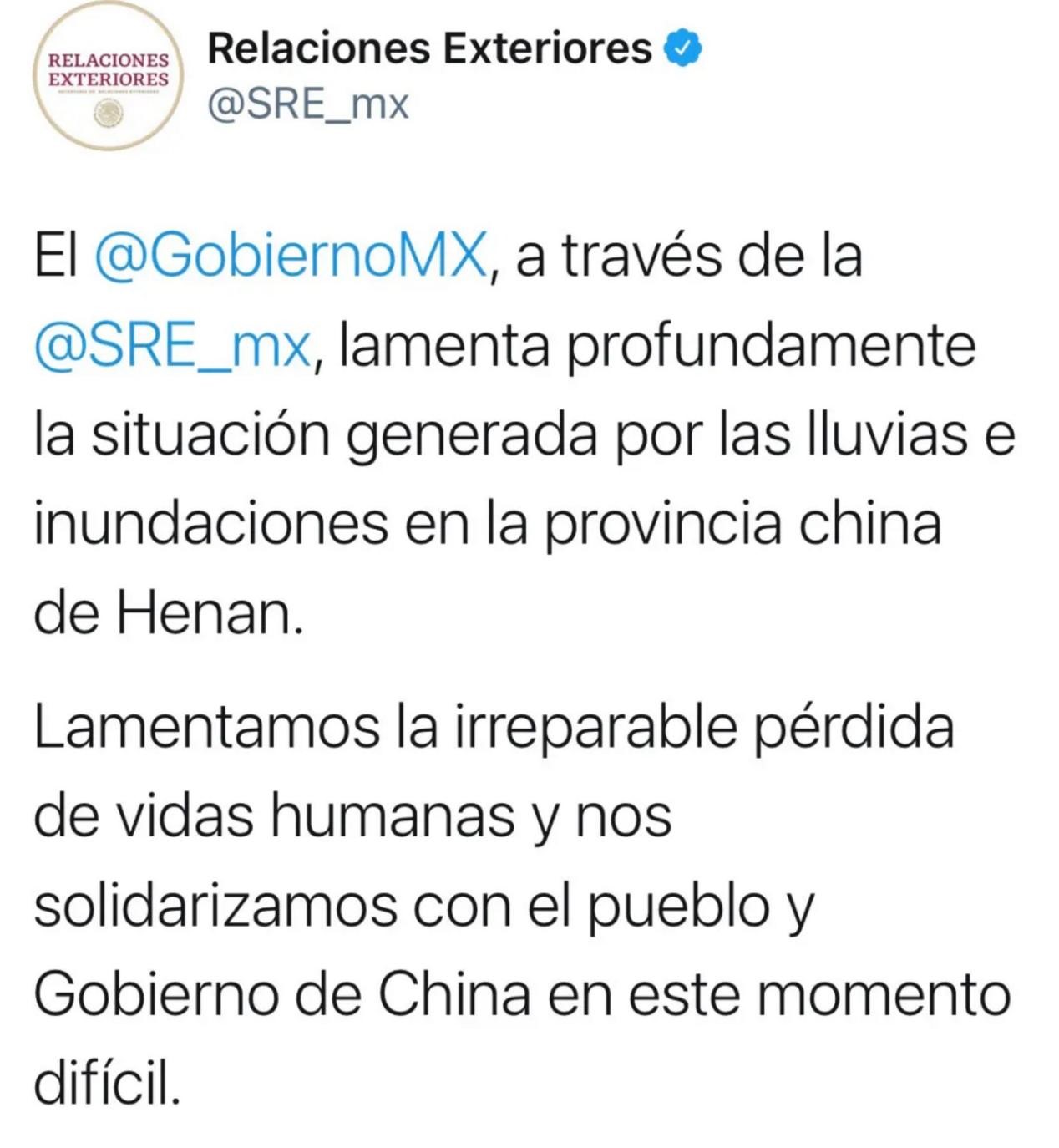 当地时间7月21日,墨西哥外交部在其官方社交媒体账号发文,代表墨西哥政府就中国河南省遭受暴雨灾害表达深切慰问,向遇难者表示哀悼,愿同中国政府和人民一道共度时艰。
