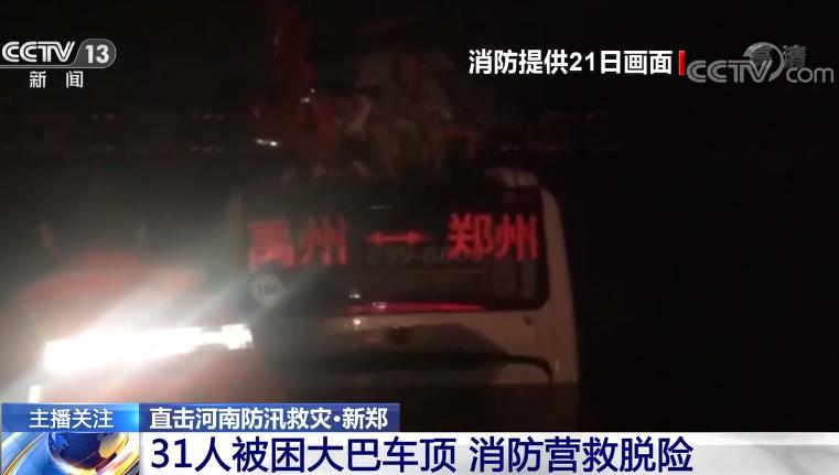 7月21日凌晨3点左右,河南新郑一辆大巴车被洪水围困,31名群众被困在大巴车顶上,消防人员到达现场时,现场水位高度已达到2.8米左右,被困人员危在旦夕。消防人员先将安全绳进行串联,再利用橡皮艇多次往返展开营救,救援人员率先将被困的老人和孩子救出,再将被困的成年人转移到安全地带。截至21日凌晨4点左右,31名被困人员全部安全获救。