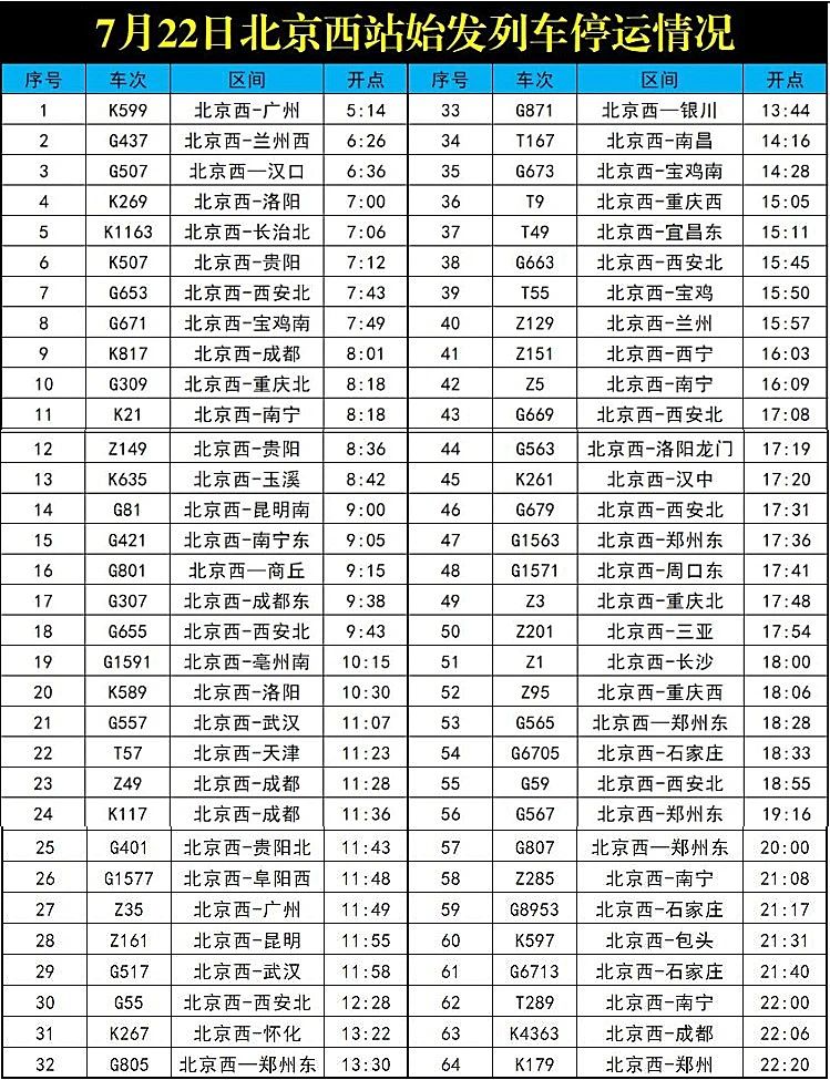 受河南多地遭遇持续强降雨天气影响,7月22日北京西站以下始发列车停运。