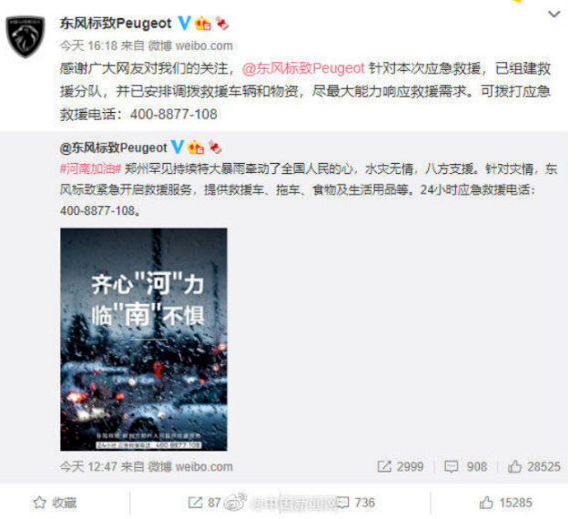 ·21日,东风标致称已就河南灾情紧急开启救援服务,提供救援车、拖车、食物及生活用品等,但随后有网友质疑:“打电话给客服,回答不提供救援。”东风标致就此回应称,已组建救援分队,并已调拨救援车辆和物资。