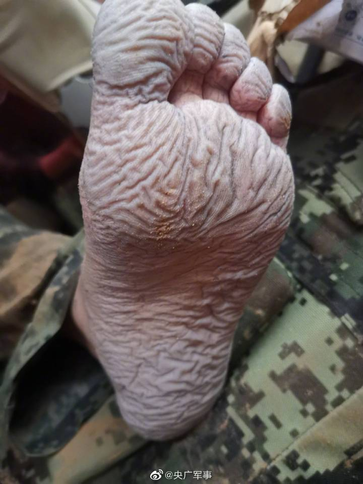心疼!武警河南总队机动支队官兵在河南郑州中牟县抗洪抢险现场,连续奋战12个小时后,脚泡到起皱发白。