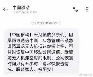 【#应急管理部紧急调派翼龙无人机恢复巩义米河镇移动公网#】记者22日获悉,应急管理部21日紧急调派翼龙无人机空中应急通信平台,跨区域长途飞行,历时4.5个小时抵达河南省巩义市,18时21分进入米河镇通信中断区,利用翼龙无人机空中应急通信平台搭载的移动公网基站,实现了约50平方公里范围长时稳定的连续移动信号覆盖,为灾区居民及时报告灾情、报送平安恢复了移动公网信号,打通了应急通信保障生命线。(记者魏玉坤、高亢)
