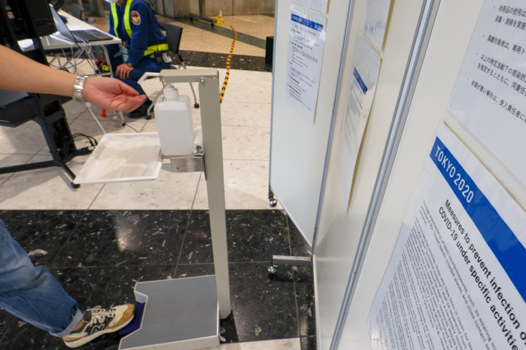 资料图:东京奥运会主新闻中心入口处的手部消毒设施。新华社记者徐子鉴摄
