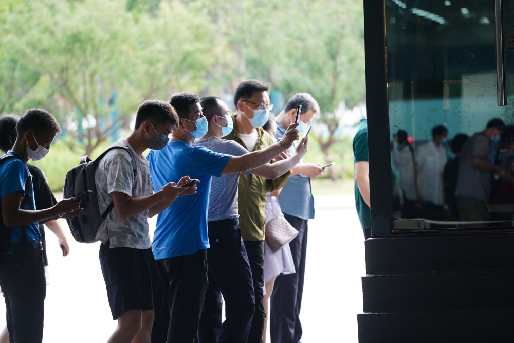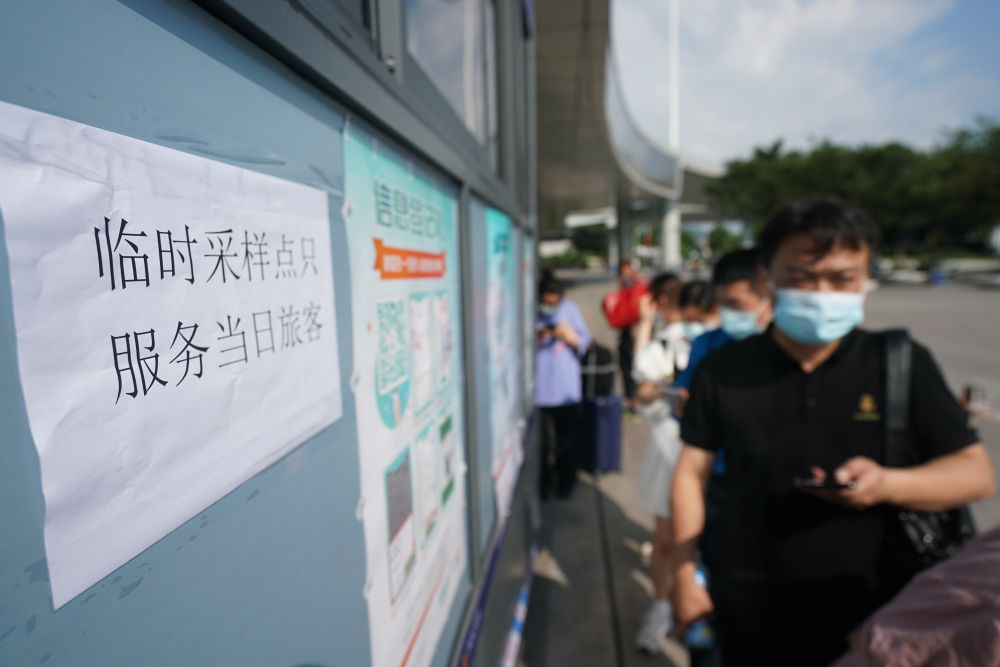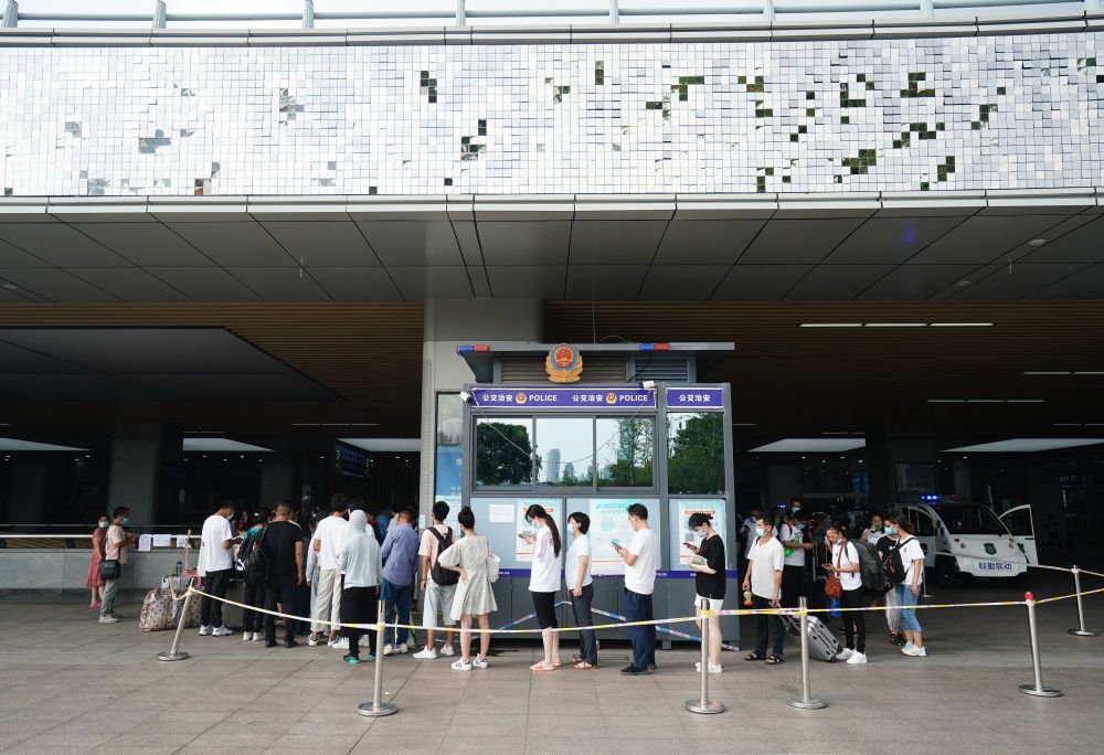 ↑7月22日,在南京站站前广场核酸检测点,旅客排队等待检测。