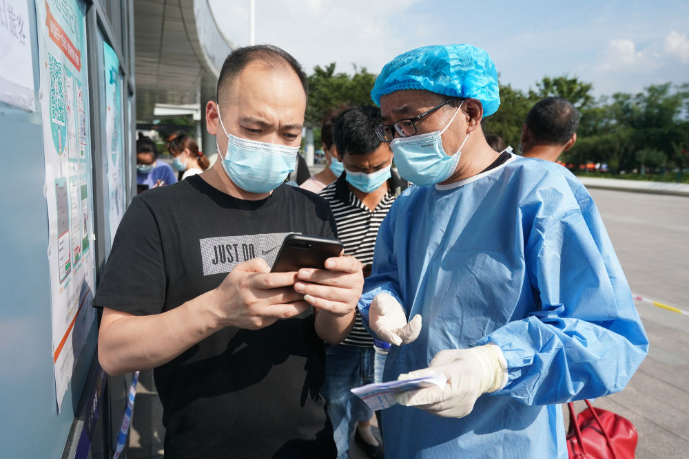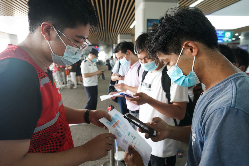 ↑7月22日,在南京站站前广场核酸检测点,志愿者帮助旅客登记信息。