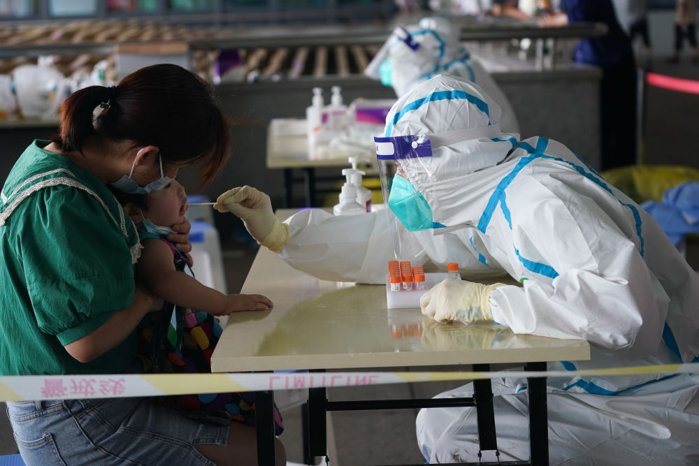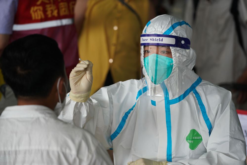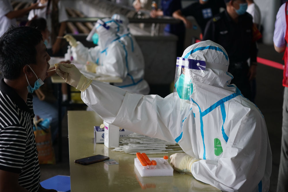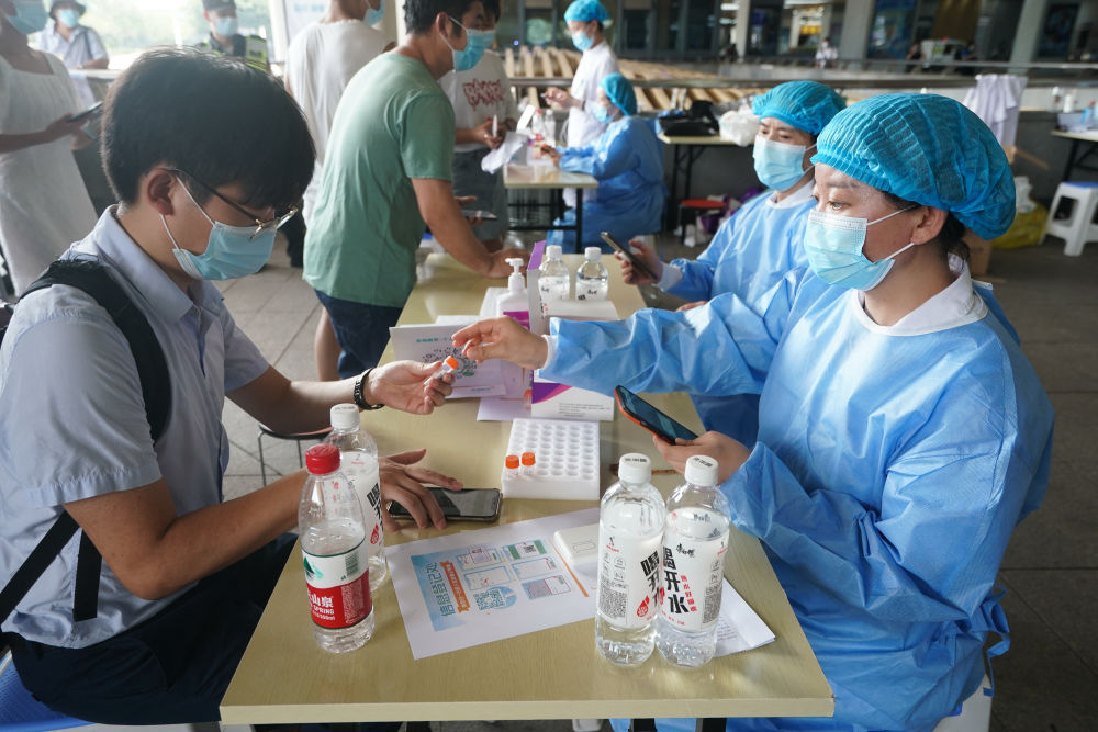 ↑7月22日,在南京站站前广场核酸检测点,医务人员为旅客进行核酸检测取样。