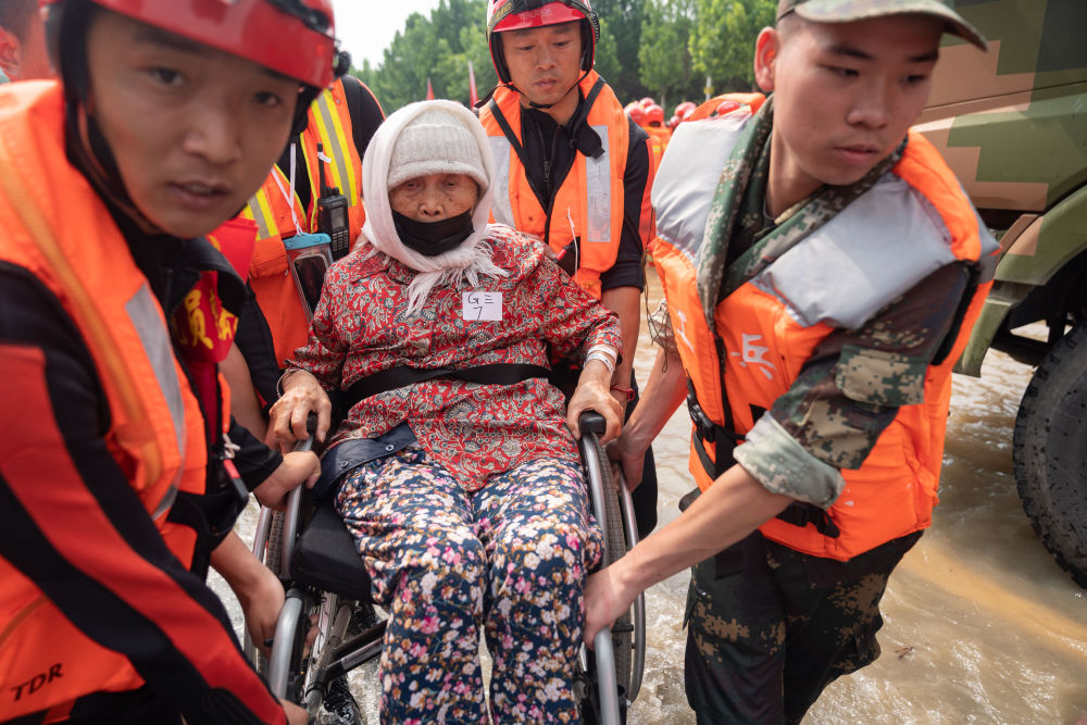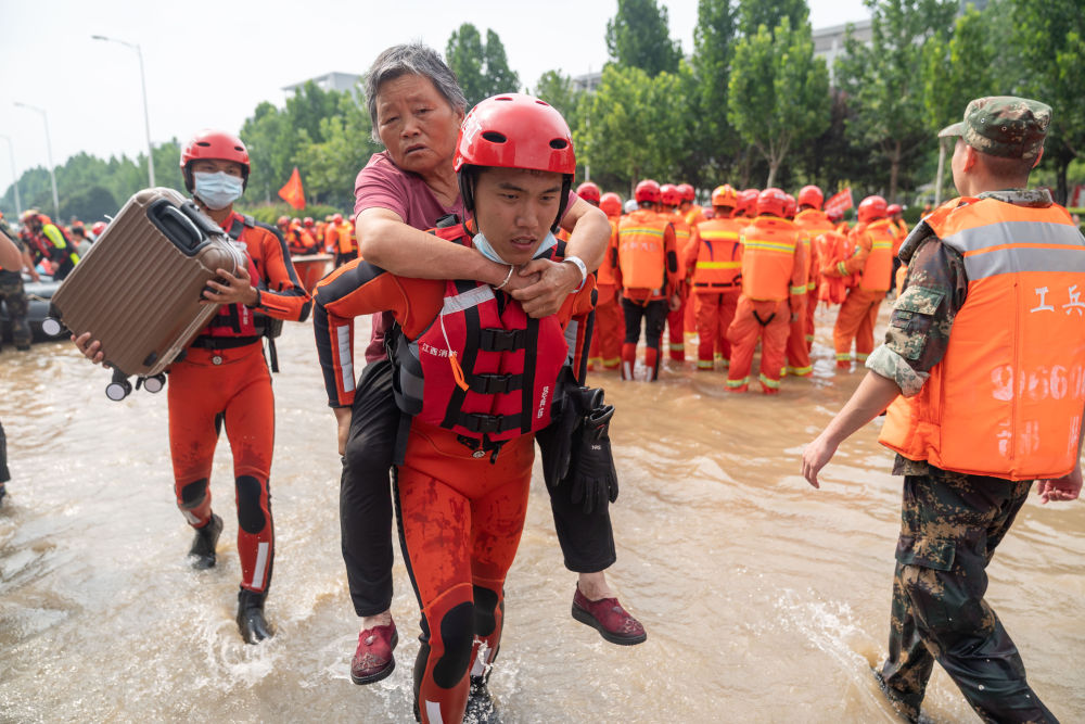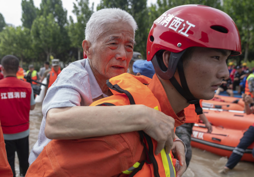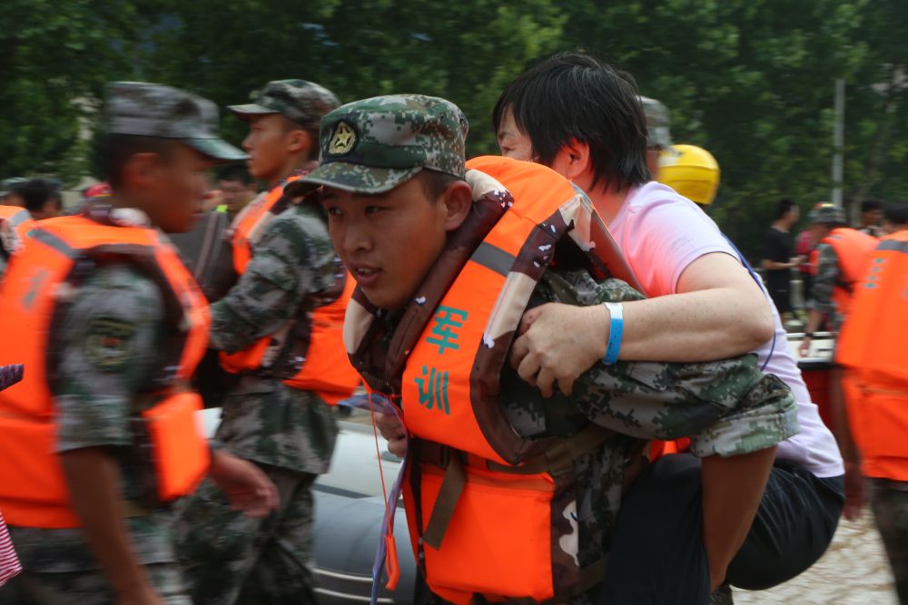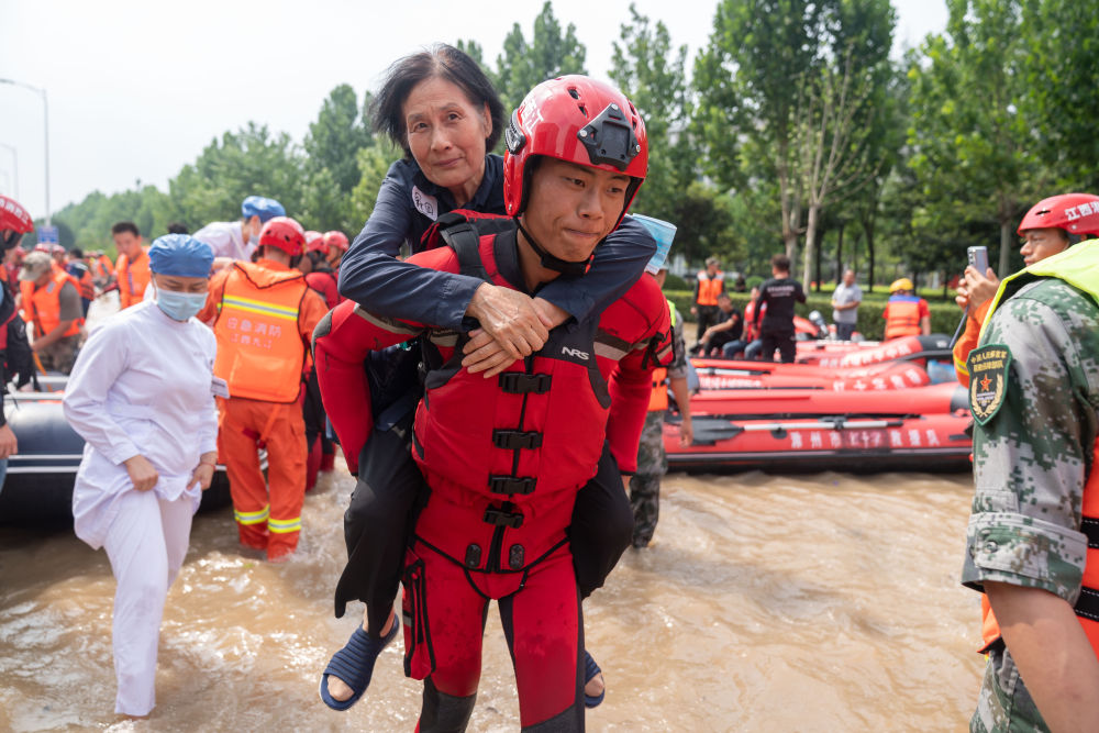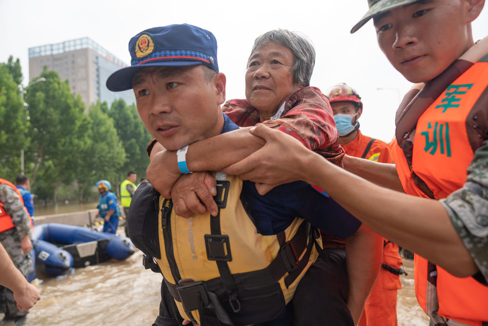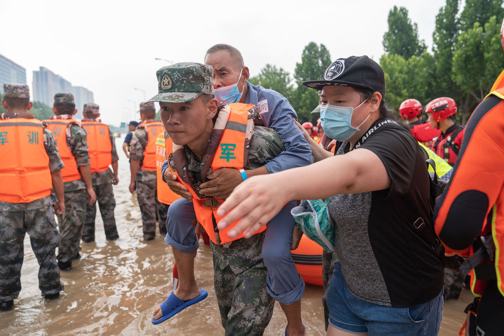 ↑7月22日,在阜外华中心血管病医院附近,救援人员背着病患转移。