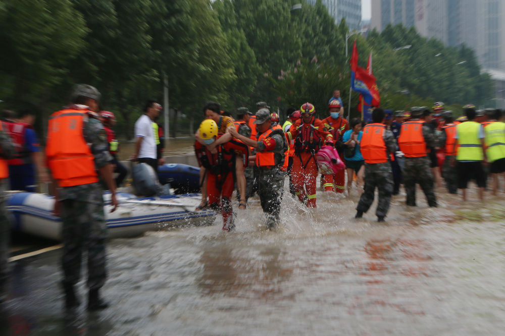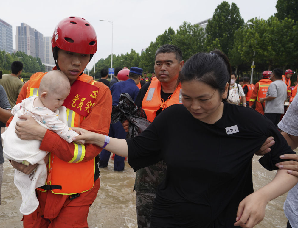 ↑7月22日,在阜外华中心血管病医院附近的锦绣路与郑开大道交叉口,救援人员转移病患。