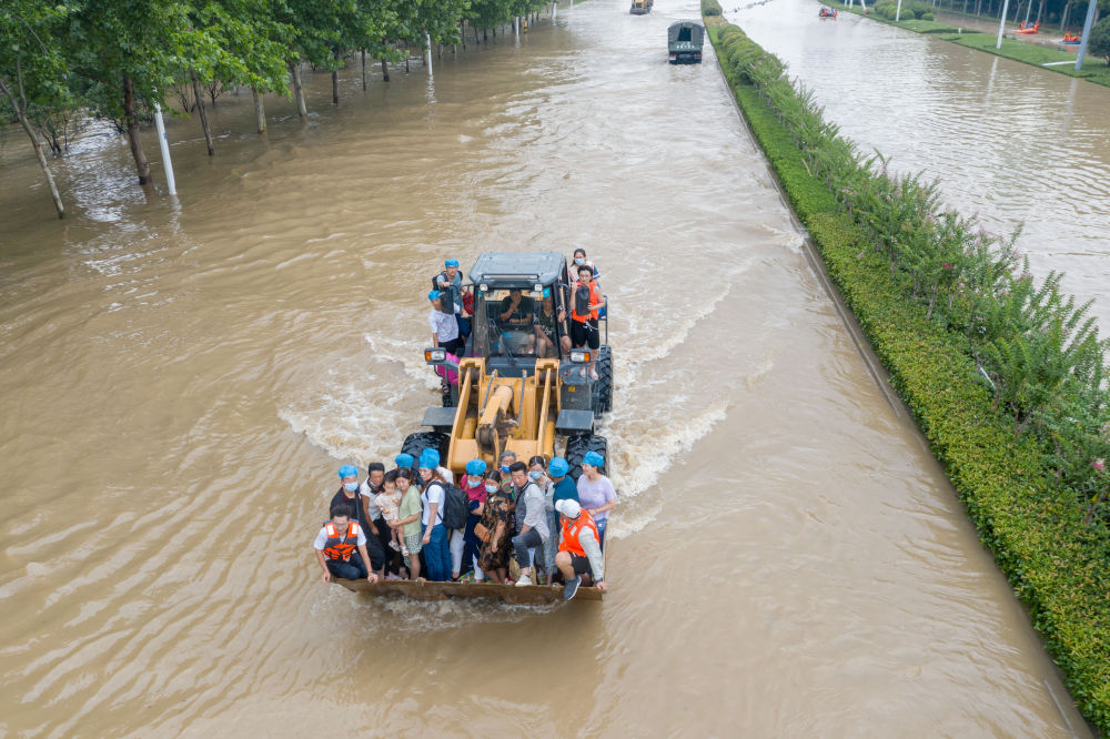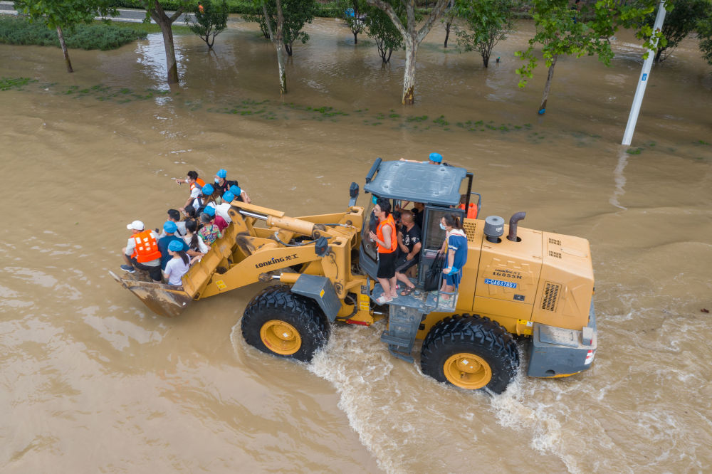 ↑7月22日,在阜外华中心血管病医院附近的锦绣路与郑开大道交叉口,救援人员利用铲车转移人员(无人机照片)。