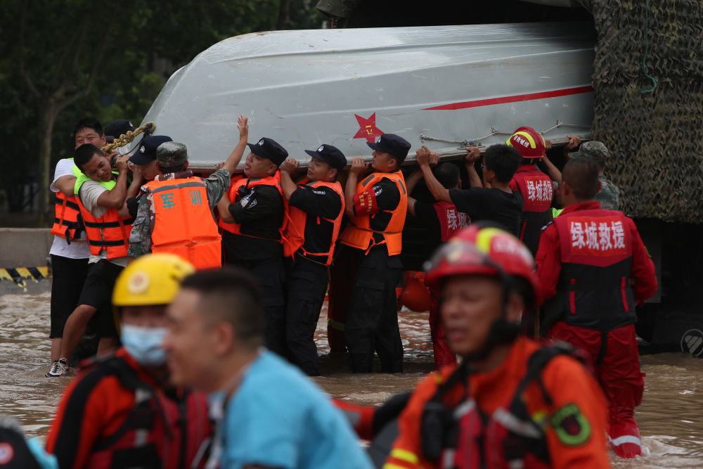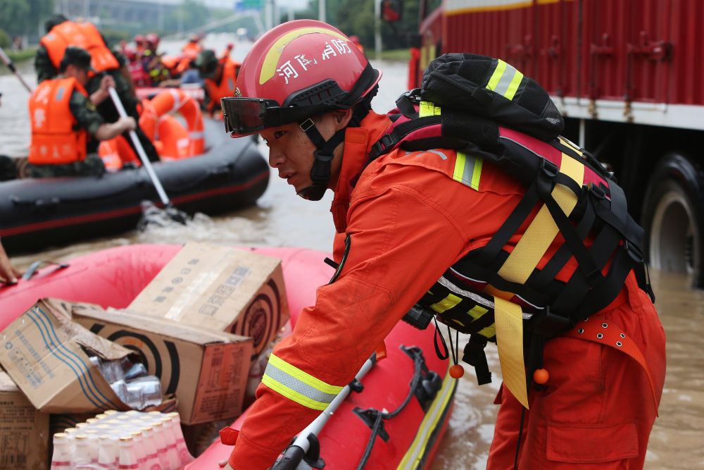 ↑7月22日,在阜外华中心血管病医院附近,救援人员卸下救援船。